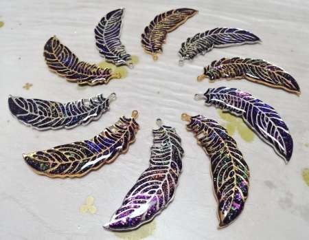 レジンアクセサリー(羽根のバッグチャーム、ブレスレット他)、ビンテージガラスのアクセサリー(ネックレス、ブレスレット)