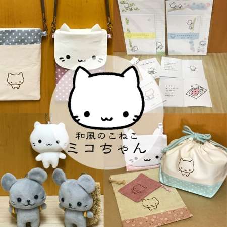 オリジナルキャラのネコの「ミコちゃん」の絵本、レターセット、カレンダー、巾着、バッグ、マスコット。