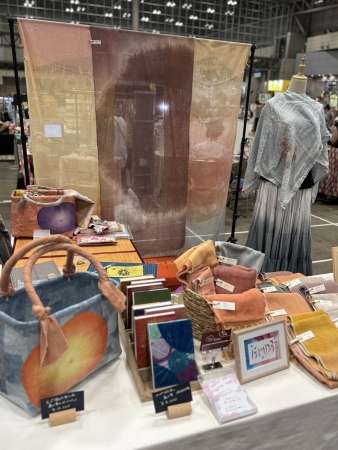 泥染めストールなど染色製品/蓮の葉など天然素材を使ったカゴバックや御朱印帳など雑貨類/衣類