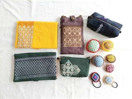 こぎん模様をワンポイントに帆布・大漁旗・ジーンズなど身近にある布と組み合わせて作ったポーチ、スマホケース、トートバッグ、サコッシュ など、日用雑貨、アクセサリー他