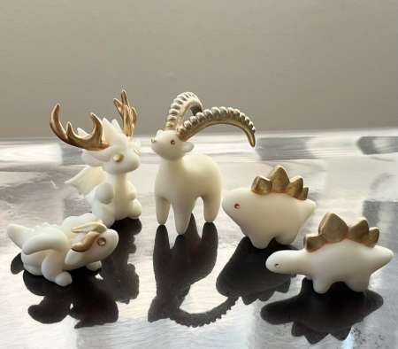 かわいい動物や恐竜、ロボットフィギュア、芸術的な バラやスズラン置物、更に新しく独特な世界観のジオラマをアクリルドームに封入した作品など新作中心に多種多彩40種類以上ご紹介いたします!グラデーションカラーで透明の作品や、金彩を施した華やかな作品は ご覧になるだけでも楽しめます!(╹◡╹) オリジナルデザイン、レジンで制作、彩色・研磨は手作業で制作しております。