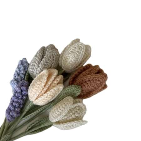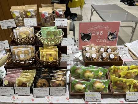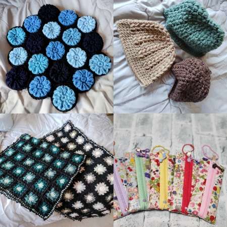毛糸の飾れるニットフラワー、コットン糸で編んだインテリアマット・コースターなどの雑貨、キャップ・ストラップなどのファッション小物