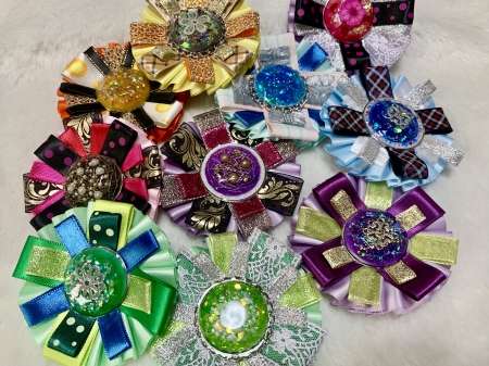 カラフルなリボンを使ったロゼット(勲章)ブローチや、レジンを使った指輪やブローチ