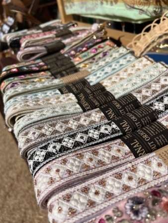 ヴィンテージボタンとインポートパーツを使ったアクセサリー インド刺繍リボンを使ったショルダーストラップと布小物