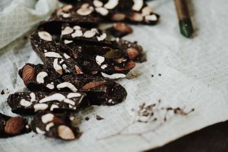 ヴィーガンチョコレート、ナッツ、グラノーラ、メープルシロップ