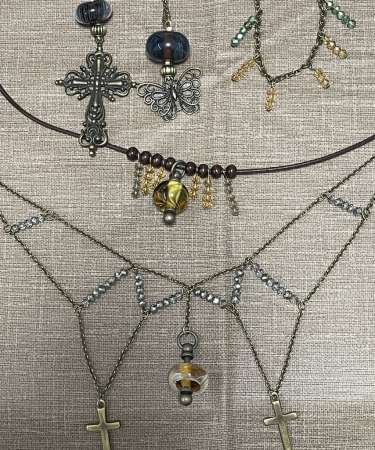 レジンアクセサリー(羽根のバッグチャーム、ブレスレット他)、ビンテージガラスのアクセサリー(ネックレス、ブレスレット)