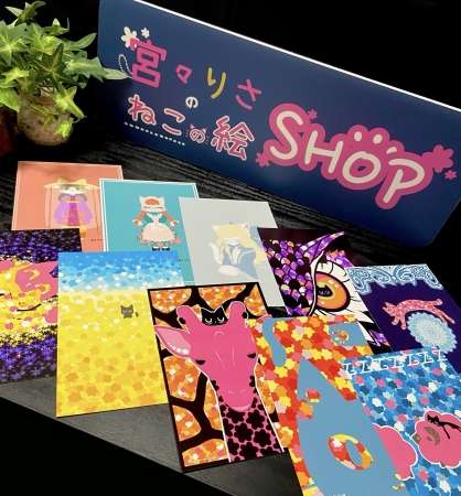 宮々りさが描いた猫の絵の 原画、ミニ原画、原画マグネットやポストカード、アンブレラマーカー、缶バッジ、缶ミラー、キーホルダー、ステッカー、クリアファイルなどのグッズを販売します。