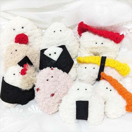 ふわふわの毛糸を編んで作ったあみぐるみとお着物や絹糸を使ったバッグや小物類の展示、販売