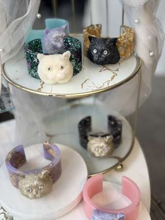気温で色が変わったり結晶が増減するネックレス、スワロフスキーとビーズのブレスレット、本物の葉脈を使った簪やキーホルダーなど