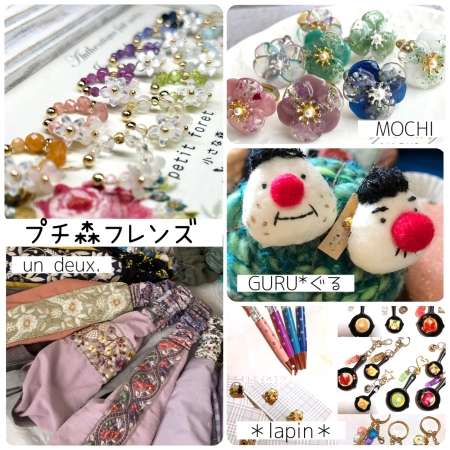 ハンドメイド作家5人のグループ出店です。 アクセサリー・バッグ・布小物・キッズ幼児用品・ミニチュア小物・ミニチュアアクセサリーなど。満足感満載のブース間違いなし!