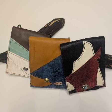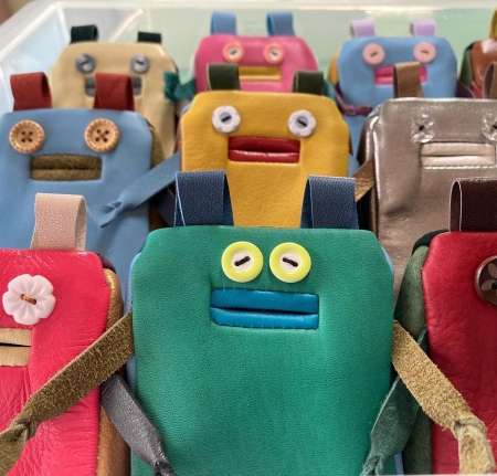 《お気楽なテイストの作品になります。貯金箱、小物入れ、小銭入れ、カードケース、ティッシュケース、散歩バック、おにぎりケース、キーケース、ポケットTシャツ、などなど…》素材は本革メインですが、帆布の作品もあります。