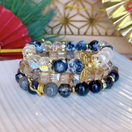 厳選した天然石と透明度の高いガラス、 大きさや形にもこだわったブレスレットジュエリーです。 さらに、ビーズとビーズの間に使う【ロンデル・スペーサー】をふんだんに使い、しっかりとした重厚感のあるデザインにしました。 他にも手描きビーズを使用したストラップやショルダーも。